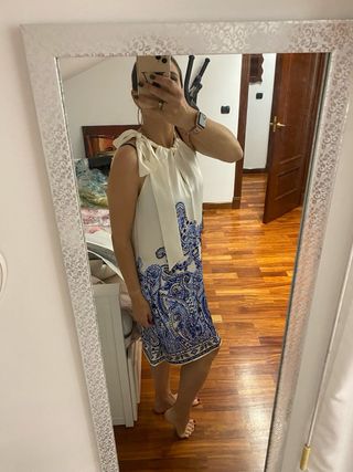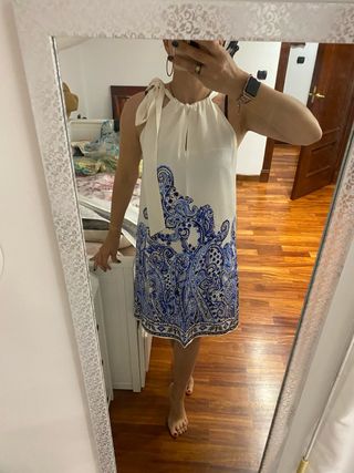Vestido de corte recto con un bonito estampado. - Diseño con cuello halter y lazo. - Detalle de abertura en el escote. - Estampado paisley en tonos azules. Solo se ha utilizado una vez para un bautizo, pero tiene una mancha amarilla en las axilas de sudor. Yo no sé quitársela, de ahí el precio que tiene. está perfecto y recién sacado de la tintorería.