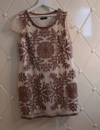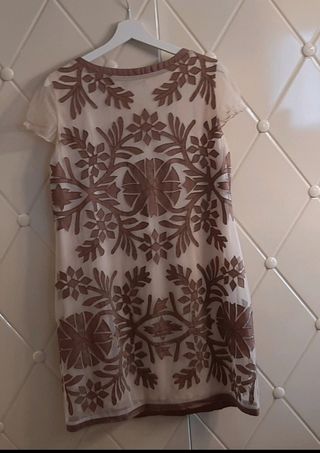 Precioso,elegante y original vestido corto de gasa color beig, con dibujos de tela color bronce bordados en relieve en la gasa. Bordado por delante y por detrás. Manguita corta fruncida. Lleva hebillas un poco altas por si se quiere añadir un cinturón o un lazo. Talla M. Ideal para evento como un bautizo o comunión. Usado, en perfectas condiciones.