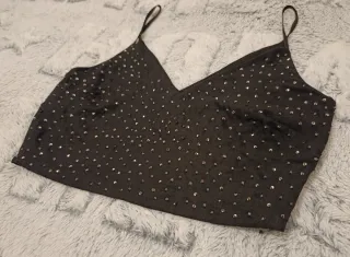 Top negro con un diseño de tirantes finos y escote en V. Está adornado con pequeños detalles brillantes por toda la prenda. ( Pone que es talla XS y es más grande, talla 36/S ). Para vestir, fiesta, noche, boda, bautizo, comunión. 🎁🔝 Si coge más prendas, podemos hacer un lote de ropa económico‼️ pregunte sin compromiso 🙋🏻♀️🙂