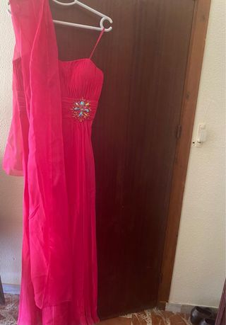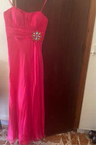 vestido largo en color rosa fucsia en perfecto estado. Ideal para bodas, bautizos, graduación y fiesta. - Diseño con tirantes finos. - Escote pronunciado ( cerrado con una puntada, pero se puede quitar). - Abertura lateral en la falda.