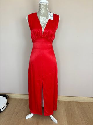 Elegante vestido largo de Zara en color rojo ideal para una cena romántica o fiestas boda bautizo Presenta un escote pronunciado NO NEGOCIABLE (no molestar si no te interesa)Gracias - Tejido satinado. - Diseño sin mangas. - Corte maxi con abertura.