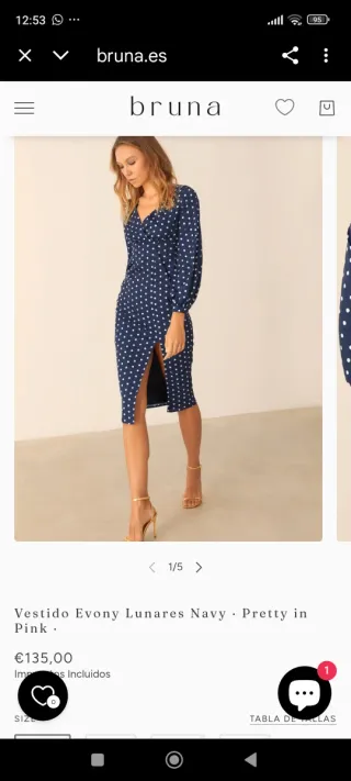 Vestido midi de la marca Bruna con un estampado de lunares. - Diseño midi. - Estampado de lunares blancos sobre fondo azul marino. - Escote pronunciado. - Mangas largas Solo puesto un día pongo fotos de la cremallera subida y bajada y mando más fotos si es necesario y medidas