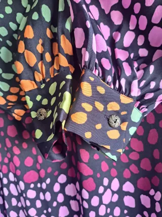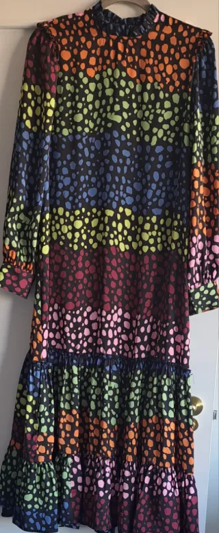 Vestido de la firma "Never Fully Dressed", que vende en ASOS. Talla 38. Con colores muy bonitos como se ve en las fotografías. Se puede lavar en lavadora. Utilizado un día. Precioso para una boda, una cena, una fiesta y también en cualquier momento. Costó 160 euros. Se puede ver y probar sin compromiso alguno.
