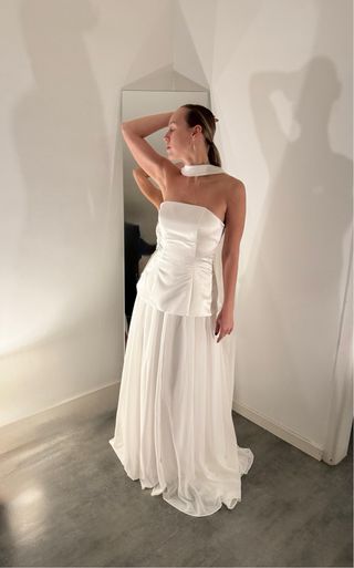 Vestido de novia minimalista y muy elegante, perfecto para una novia moderna. Está completamente nuevo y sin estrenar: al final elegí otro vestido para el día. El corpiño tipo corsé con drapeado realza la silueta, mientras que la falda ligera y fluida se mueve con mucha delicadeza al caminar. Incluye una capa/pañuelo vaporosa que crea un efecto de cola precioso en las fotos. Es talla M, pero tiene bastante largo, ideal para una chica alta o para llevar con tacones. Perfecto para una boda, ceremonia íntima o registro. El color es un blanco lechoso muy limpio que aporta un toque delicado y sofisticado.