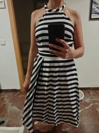 Súper original. Vestido o chaleco largo con aberturas en los laterales y forro, y pantalón de pinzas recto con bolsillos y abertura en el bajo interior. Es de la temporada 2024-25. De edición limitada. El vestido-chaleco costó 89'95 y el pantalón 59,95. Es tela de buena calidad, gordita. D la gama alta de Zara. Tuve una boda en diciembre y lo llevé ese día sin nada debajo y un abrigo y lo he usado otro día para una comida de trabajo con el polo debajo. Está perfecto. Las marquitas blancas q se ven en algunas fotos son d la cámara y el cristal, no tiene marcas ni desgastes el conjunto. La parte de arriba es XS y la parte de abajo