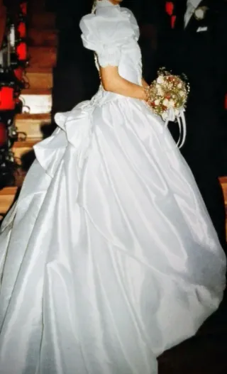 Elegante vestido de novia estilo princesa, ideal para una boda de primavera o verano. Su diseño voluminoso y romántico te hará sentir especial en tu gran día. - Cuerpo con detalles de encaje y pedrería. - Mangas abullonadas. - Falda elaborada en tela de seda salvaje, amplia y vaporosa con cola. - Lazos decorativos en la cintura. Su diseño permite hacer cambios en las mangas para ajustarse a tu gusto. Entrega en persona.
