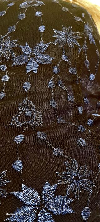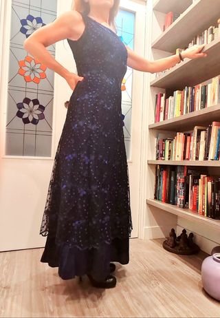 precioso vestido de yirantes con un tejido tipo gasa en azul noche con unos pequeños puntitos celestes talla46, mide 46 cms de sisa sisa y 84 de sisa a bajo