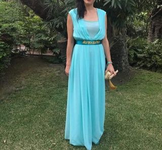 Lo he llevado una vez para el banquete de una boda. Talla M, muselina en el exterior y satén en el interior. Bonito vuelo al andar. Ajustado y drapeado a nivel del pecho y decorado con pedrería y lentejuelas. Cierra en la espalda con cremallera oculta. Sujetador incorporado. Muy confortable de llevar. Largo total 154cm. Posible entrega en mano, y trueque.