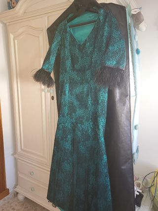 vestido de fiesta madrina, boda de noche, diseñadora Nati Jiménez talla 42, lleva como una pequeña torera que cubre el brazo hasta media manga con plumas en terminación.