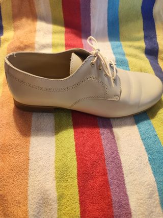 Zapatos Blucher Lino. Color Blanco Roto. En la caja indica talla 37. Yo he medido la plantilla y son 23cm. Lo digo porque creo no tallaba bien y por eso no lo utilicé. Están nuevas, sin uso ninguno. En su caja. Vienen con dos juegos de trencillas. Ideales para vestir a niños en comuniones, bodas y bautizos.