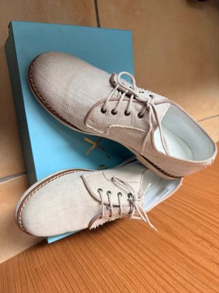 Preciosos zapatos de comunión para niño/a, talla 33-34. Son de un delicado color beige y están hechos de lino. Ideales para un evento especial. - Fabricados en lino. - Talla 33-34. - Diseño clásico y elegante. - Perfectos para una ocasión especial.