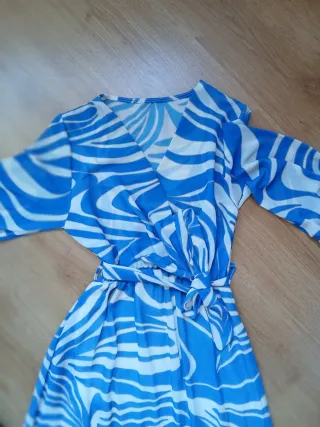 Vestido con un llamativo estampado en tonos azules y blancos. Presenta un diseño cruzado con cinturón. - Estampado de líneas onduladas. - Cinturón anudado a la cintura. - Escote en V. Talla única. Puesto únicamente para una Comunión. Ideal con unos zapatos del mismo color que hay en mi armario. Ideal.