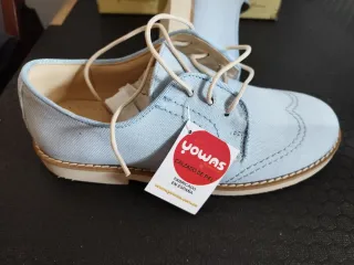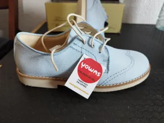 Zapatos de comunión de la marca Yowas, sin estrenar.talla 34. - Color azul. - Calzado de piel. Material: Piel (serraje) y lino natural Estilo: Zapato tipo blucher con picados y cierre de cordones Color: Azul celeste Fabricación: 100% hecho en España Características: Suela ligera y flexible de goma, forro interior de piel transpirable y plantilla anatómica .