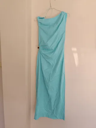 Elegante vestido midi con diseño asimétrico y detalle de aplique. Detalle de aplique dorado en cintura. Forro interior. Bajo con abertura en espalda. Cierre lateral con cremallera oculta en costura. Turquesa - Tejido con lino. - Corte favorecedor. - Ideal para eventos. Zara Talla M Vestido ideal para invitada evento ceremonia boda bautizo comunión graduación #invitadaperfecta #invitada #invitadaboda #invitadaideal #invitée #invitéemariage #inviteparfait #weddingdress #inviteeceremonie #invitadalowcost #invitadaconestilo #mariage