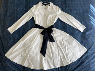Vendo vestido camisero blanco con lazo y cuello en contraste en azul marino de Cortefiel. Le quité la etiqueta pero nunca lo he usado, está nuevo a estrenar. Marca talla S pero da talla y es equivalente a una tal 40. Súper elegante e ideal para bautizos, comuniones, cocktails o para ir a trabajar. Manga larga, con botones camiseros hasta la cintura. Falda con muchísimo vuelo y forro. 2 bolsillos laterales. Tejido exterior 100% de algodón grueso y estructura de líneas. Medidas aproximadas (cm): Axila a axila 40 Hombro a hombro 47 Hombro a muñeca 59 Cuello a cintura 40 Largo falda desde cintura 63,5 Entrega en Sanchinarro, Bernabéu