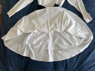 Vendo vestido camisero blanco con lazo y cuello en contraste en azul marino de Cortefiel. Le quité la etiqueta pero nunca lo he usado, está nuevo a estrenar. Marca talla S pero da talla y es equivalente a una tal 40. Súper elegante e ideal para bautizos, comuniones, cocktails o para ir a trabajar. Manga larga, con botones camiseros hasta la cintura. Falda con muchísimo vuelo y forro. 2 bolsillos laterales. Tejido exterior 100% de algodón grueso y estructura de líneas. Medidas aproximadas (cm): Axila a axila 40 Hombro a hombro 47 Hombro a muñeca 59 Cuello a cintura 40 Largo falda desde cintura 63,5 Entrega en Sanchinarro o Bernabéu