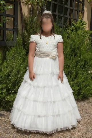Vestido de comunión con un diseño delicado y elegante. - Cuerpo de encaje con detalles florales. - Cinturón de tela de lino. - Falda vaporosa. - Adorno de encaje en la cintura. -Utilizado un día. -Para niña de 8-9 años
