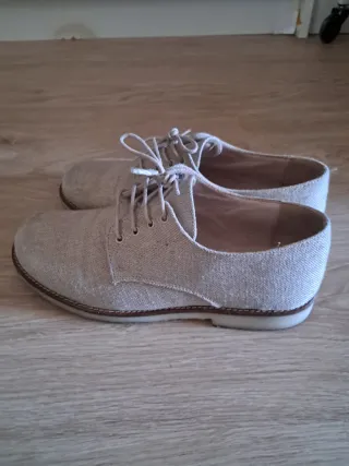 Elegantes zapatos de lino para niño, perfectos para celebraciones como la comunión. Su diseño combina comodidad y estilo. Se usaron solo el día de la comunión. Costaron 65€ - Material exterior de lino. - Cordones de ajuste en color beige. - Suela de goma para mayor durabilidad.