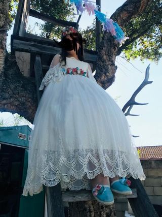 Vestido de comunión talla 9 (pecho 72 cm y largo 125 cm) de la colección de 2024 de la firma Mon Air color crudo y aguamarina. Confeccionado en tul bordado y encajes. Corte romántico, manga francesa rematada pegada, talle corto y flores en el fajin de color verde agua. Se incluyen las flores delantera y trasera, cancan y esparteñas de la firma OKAASPAIN de la talla 33. Solo usado el día de la ceremonia.
