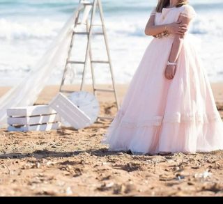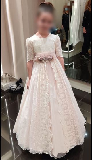 Precioso vestido de comunión para niña, de manga francesa. Es de color rosa nude muy claro. Diseño elegante y delicado. Tiene mucho cuerpo y volumen. 1 sólo uso - impecable - Talla: G (120) - Incluye: Un vestido.