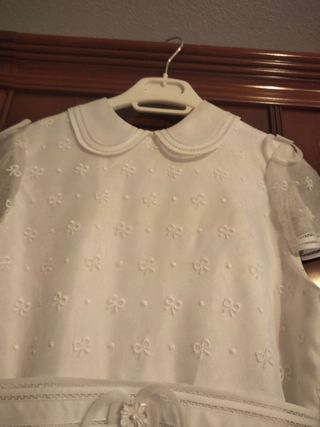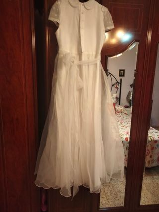 Vestido de comunion,completamente nuevo,era el de muestra, es de la marca Rosa Clarà de la coleccion AIRE, es largo y de fabricacion española, su tamaño en centimetros es de 37 de pecho en plano, 33 de cintura en plano y su longitud es de 120 centimetros, su talla corresponde a una 115 de vestidos de comunion, es de ORGANZA en mate blanco,tienes botones de perlita en la parte posterior y le falta un boton que es el de abajo del todo y no se ve pero se puede comprar en cualquier merceria y ponerlo,al ser un vestido de alta costura si se tiene que hacer alguna modificacion no hay ningun problema tanto para sacarle una talla aproxim