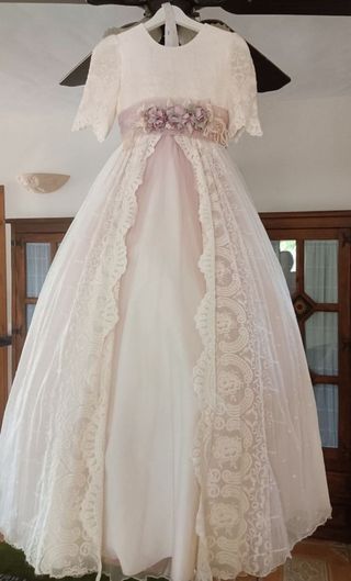 Precioso vestido de comunión de niña, de.la marca rosa clara, con su funda. Utilizado solo una vez. Viene con zapatos bordados talla 38 y accesorio de pelo a juego con el vestido.