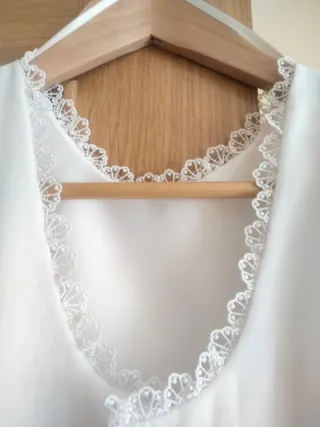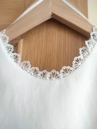 Vestido de comunión usado 2 veces. Se puede ajustar para hacer más estrecho y corto o también agrandarlo ya que a mi hija se lo ajustó la modista. Incluye cantan. No incluye el broche de flores (es un broche suelto). El lazo y los detalles de las mangas van en rosa claro/salmón. - Cuello redondo. - Espalda escote V.