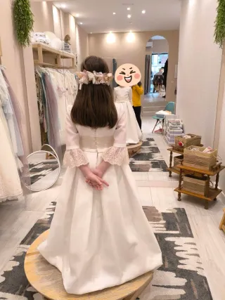 Vestido de comunión elegante, ideal para una ocasión especial. Diseñado con detalles delicados y un corte clásico. - Cuerpo con manga larga y encaje. - Cinturón adornado. - Falda amplia y vaporosa.