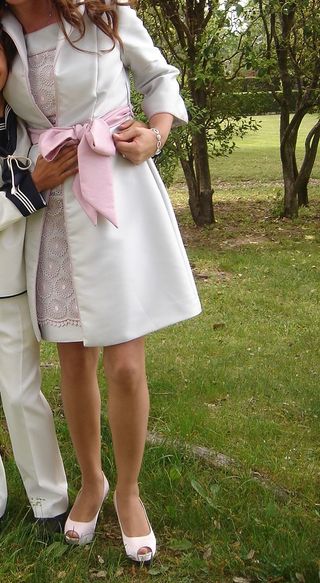 Vestido más abrigo de boutique, alta costura rosa palo y gris, de guipur.uso una sola VeZ, costó más de 200€ se da fra.