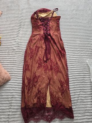 Precioso vestido para fiestas, ideal para ocasiones especiales. Es de color morado y tiene un diseño elegante y sofisticado. - Escote cruzado en la espalda. - Bajo con volantes. - Confeccionado con tejido brillante. Usado una única vez para una comunión.