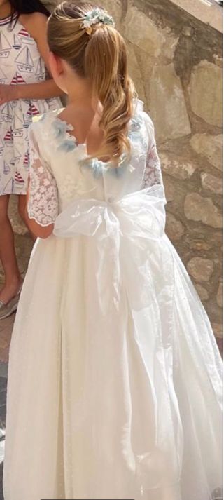 Vestido de comunión para niña, elegante y delicado. - Diseño con mangas de encaje. - Detalle de flores azules en el escote. - Lazada grande en la espalda. - Falda vaporosa con detalles sutiles. - Talla 115 - Marca vestido De Blanco
