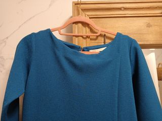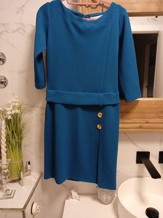 Bonito vestido azul intenso de licra cuello barco y manga francesa. Queda ajustado y con un corte en la cintura/cadera para hacerlo más atractivo. La falda con abertura. Por debajo de las rodillas. Sirve para vestir, para ir arreglada al trabajo y según los complementos que le pongas, sirve para eventos como comuniones, bautizos, etc. Comprado en boutique y actualizado en una modista. Sirve para talla 38/40 al ser de licra, se adapta al cuerpo. Bonita caída de la falda.