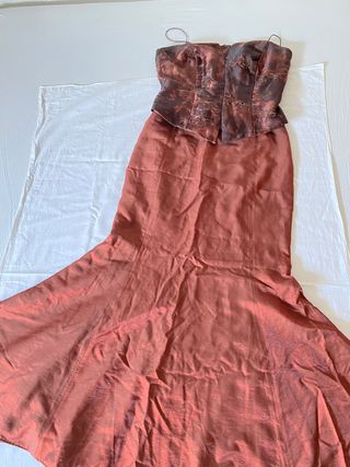 Vestido de fiesta T.46 falda y corpiño ideal dama de honor, bodas ,bautizos, comuniones. Me costó 160 euros. Color marrón con aguas. Puesto queda genial ULTIMAS FOTOS CON MEDIDAS LARGO DE FALDA ( va por encima de la cintura para que tape el corset)110cm El corset lo más flojo atado da hasta 42cm aprox