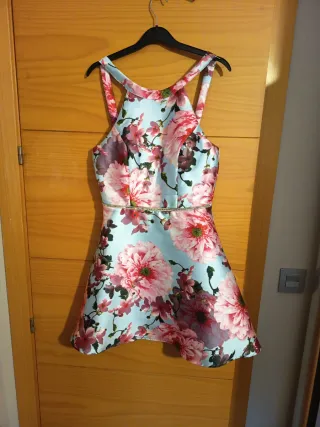 Vestido con estampado floral, ideal para eventos especiales. - Diseño de tirantes. - Cintura adornada con pedrería. - Falda con vuelo. - Lleva cascos, se puede poner sin sujetador - Hasta las rodillas - Marca: Formula Joven
