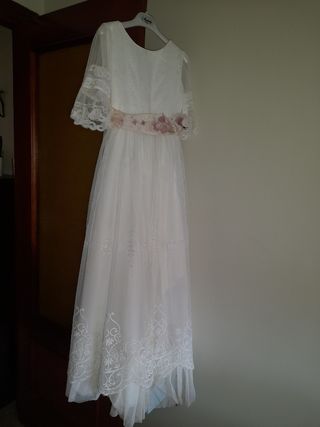 vestido de comunión de segunda mano. con su caja. tiene los bajos un pelín rozados. Mi hija mide aprox 1,28 por si os ayuda y la queda perfecto de largó.