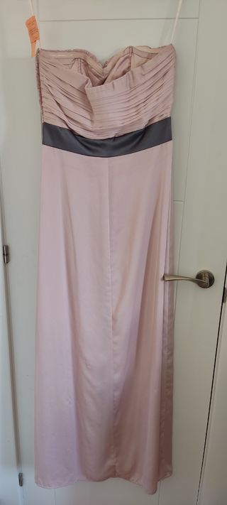 Vestido de fiesta largo de H&M ideal para una boda,bautizo o comunión. Color rosa palo con flores y detalles color gris. Escote palabra de honor y cremallera en el lateral. Solo usado una vez Talla 36