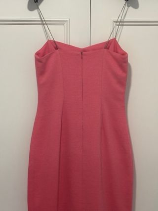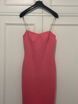 Vestido entallado, tirantes brillantes, pequeña abertura trasera, totalmente forrado, excelente calidad tela. Ideal para comuniones, bodas de día. Tiene chaqueta a conjunto excelente tambien.