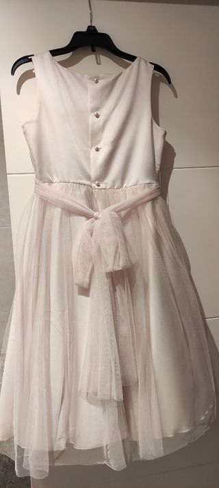 Vestido usado una sola vez para una comunión. Es muy arreglado. La parte superior es más ajustada y la inferior olgada caidito por la parte de atrás. Es un vestido muy elegante para un evento. Lo usé para una comunión.