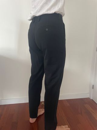 Pantalón negro de ZARA, elegante y versátil, sin pinza. Corte limpio, adecuado tanto para vestir formal como para un uso más diario arreglado. Talla 38. Composición: 63% poliéster, 32% viscosa, 5% elastano. De segunda mano, usado en varias ocasiones, en buen estado general. Tejido cómodo y flexible, fácil de combinar con camisas o jerseys. ---- Evento comunión boda chino pitillo vestir diario cómodo trabajar elegante ropa hombre tela