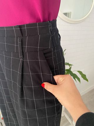 Pantalón de vestir con estampado de cuadros para mujer talla 42 de Sfera. En perfecto estado. - Diseño elegante y moderno. - Bolsillos frontales con cremallera dorada. - Cierre con botón y cremallera.