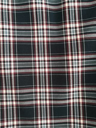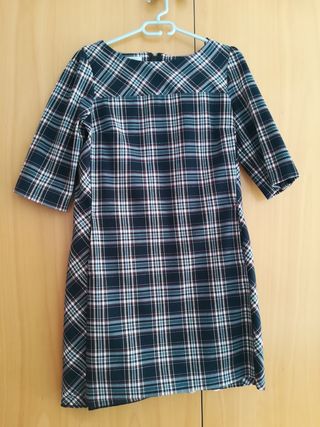 vestido de 3/4 de cuadro escocés en azul marino, rojo y blanco con bolsillos a los lados de largo por encima de la rodilla. Talla L muy poco usado
