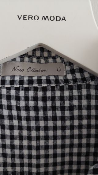Precioso vestido midi de cuadros blancos y negros de la marca Vero Moda. Es una prenda elegante y versátil, ideal para cualquier ocasión. - Vestido de corte midi. - Manga corta. - Cierre de botones.