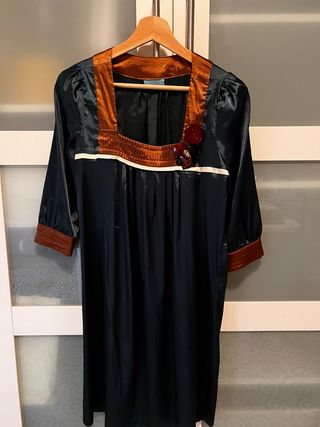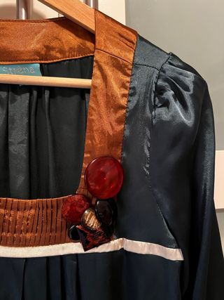 Elegante vestido de satén con un diseño único. - Tejido de satén brillante. - Cuello cuadrado con detalle de cinta. - Mangas tres cuartos con puños. - Adorno en el pecho.