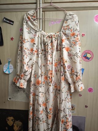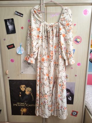 Precioso vestido largo de flores, ideal para cualquier ocasión. Es de color beige con estampado floral naranja. - Escote cuadrado. - Manga larga. - Cierre con lazo en la parte delantera. - Corte fluido y favorecedor.