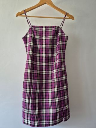 Vestido de tirantes con estampado de cuadros. Queda muy bonito puesto -Pequeña abertura en el lado izquierdo. -Cremallera por detrás. - Diseño con cinturón anudado. - Escote cuadrado.