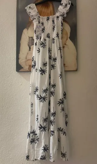 Vestido largo blanco con estampado de palmeras en contraste. Diseño con escote cuadrado y tirantes finos con volantes. - Largo maxi. - Estampado de palmeras. - Volantes en los tirantes. - Bajo con volante.