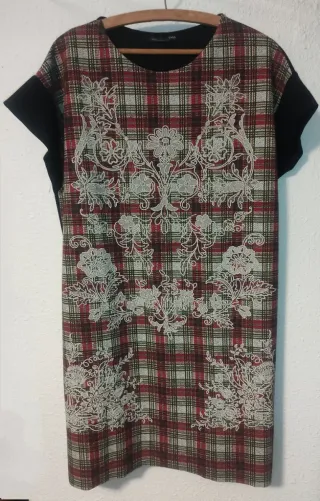 Vestido de Zara con un diseño estampado de cuadros y detalles florales. - Usado una vez. - Tejido de punto elástico, ideal para entretiempo.