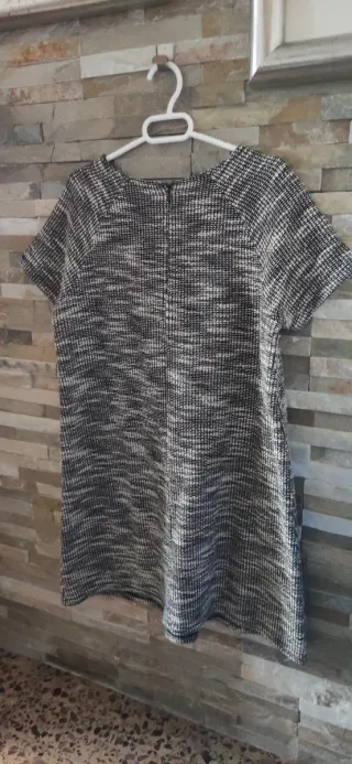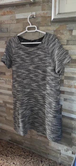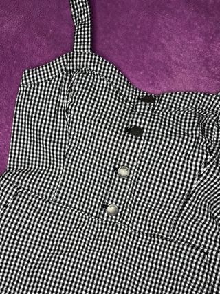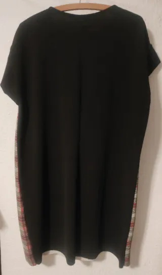 Vestido tipo camisa con un diseño de cuadros llamativo. La parte de arriba en tejido camisa mientras que la parte de abajo negra es elastica tipo minifalda. yo siempre lo utilicé con pantalones y la parte negra adentro. Dos descosidos que se pueden arreglar fácil