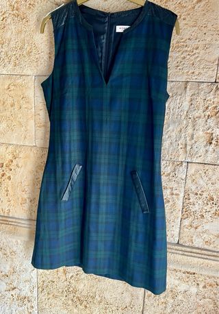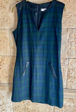 Vestido de cuadros con detalles en piel. - Diseño sin mangas. - Cuello en V. - Bolsillos delanteros con detalle de piel. - Hombros con detalle de piel. - Medidas: 47 cm axila x 86 cm largo