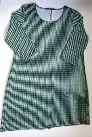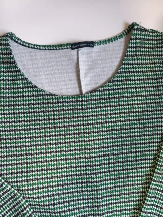Elegante y cómodo vestido de la marca Encuentro con un clásico estampado de pata de gallo (houndstooth) en tonos verdes, negros y blancos. Perfecto tanto para el trabajo como para una salida casual. Estado: Excelente estado, muy bien cuidado. Diseño: Estampado atemporal de pata de gallo con corte recto y favorecedor. Manga: Manga francesa (3/4), ideal para entretiempo. Tejido: Composición de 97% poliéster y 3% elastano, lo que le aporta una caída perfecta y un toque de elasticidad para mayor comodidad. Fabricación: Hecho en España. ⚡ ¡Envío muy rápido! #encuentro #vestidomujer #greendress #houndstooth #patadegallo #talla